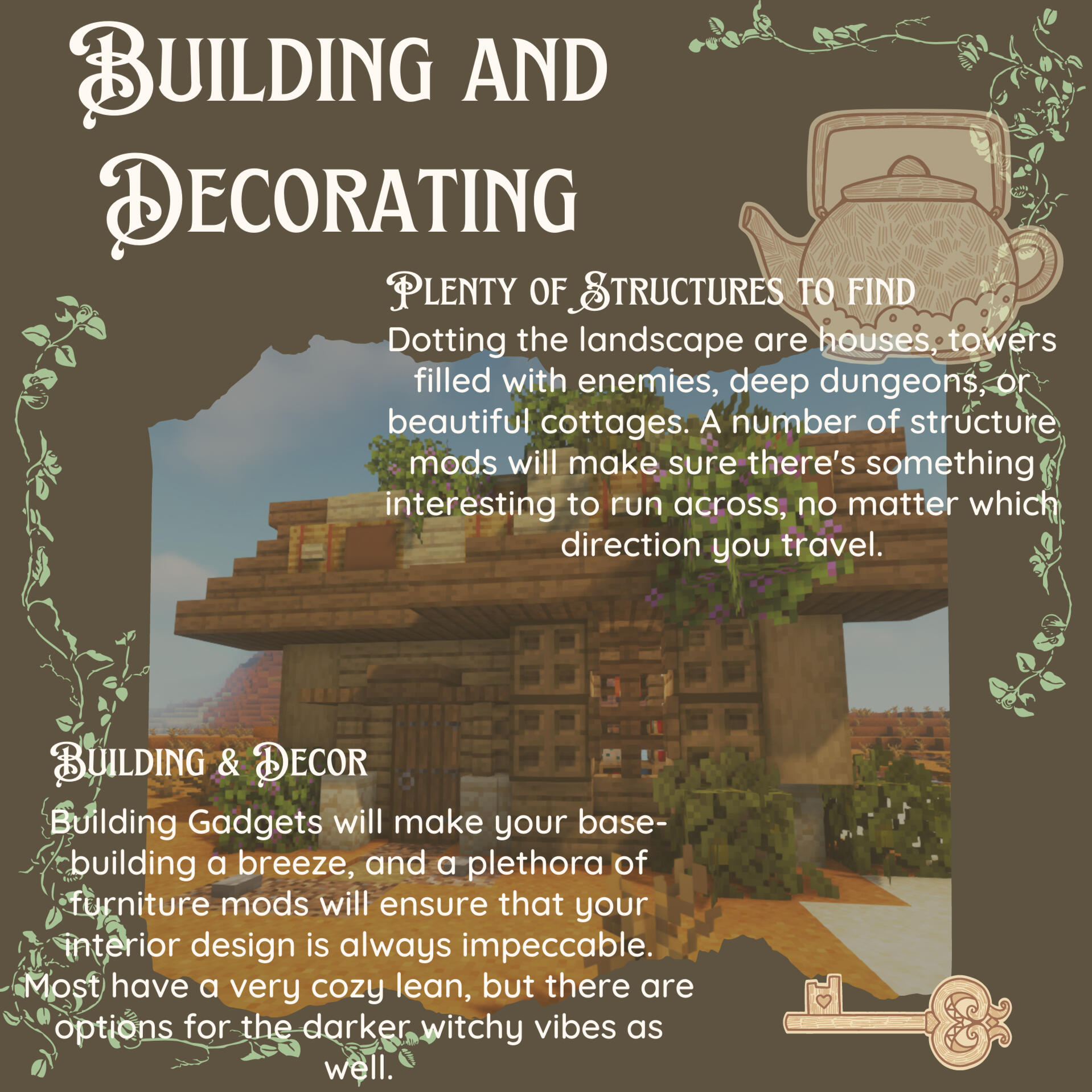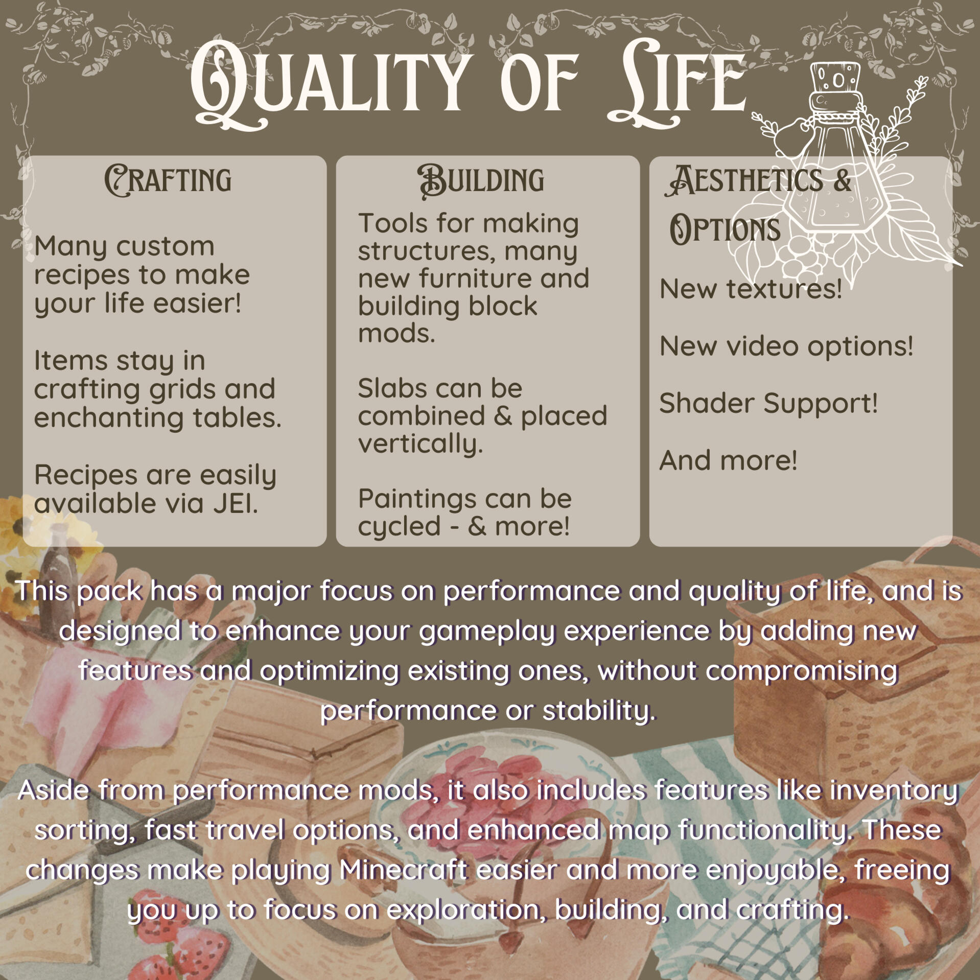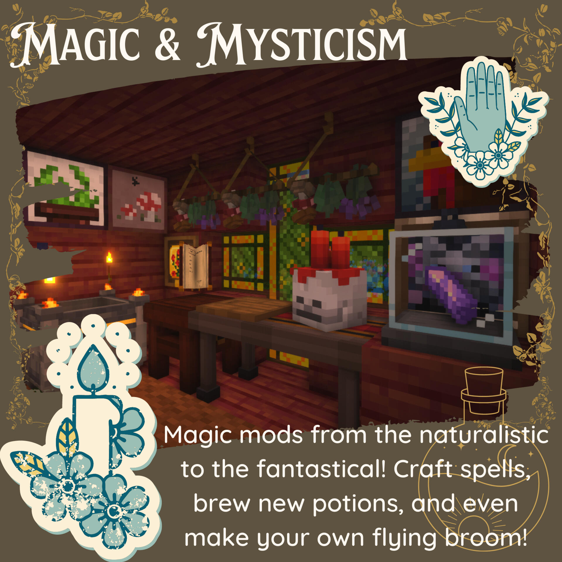 Welcome to the Features section of Cottage Witch, a modpack that adds a wealth of new content and quality of life improvements to Minecraft. With custom recipes, players can discover new ways to craft items and enhance their gameplay experience. But Cottage Witch is more than just a crafting modpack - it also features new biomes to explore, including forests and snowy areas filled with new animals and structures to find. And if you're feeling particularly adventurous, you can even journey through new dimensions, each with its own unique challenges and rewards.But for those who prefer a more domestic approach to magic, Cottage Witch has plenty to offer as well. Build the perfect cozy witch's cabin and furnish it with a variety of custom decorations, from cauldrons and broomsticks to magical crystals and books. Take advantage of quality of life features like auto-smelting and inventory sorting to streamline your gameplay experience. And with powerful magic mods like Hexerei and Ars Nouveau, you'll have the tools you need to take on any foe that comes your way.Whether you're looking for adventure or simply want to create the perfect home base, Cottage Witch has something for everyone. So why not give it a try and discover the magic of this enchanting modpack?