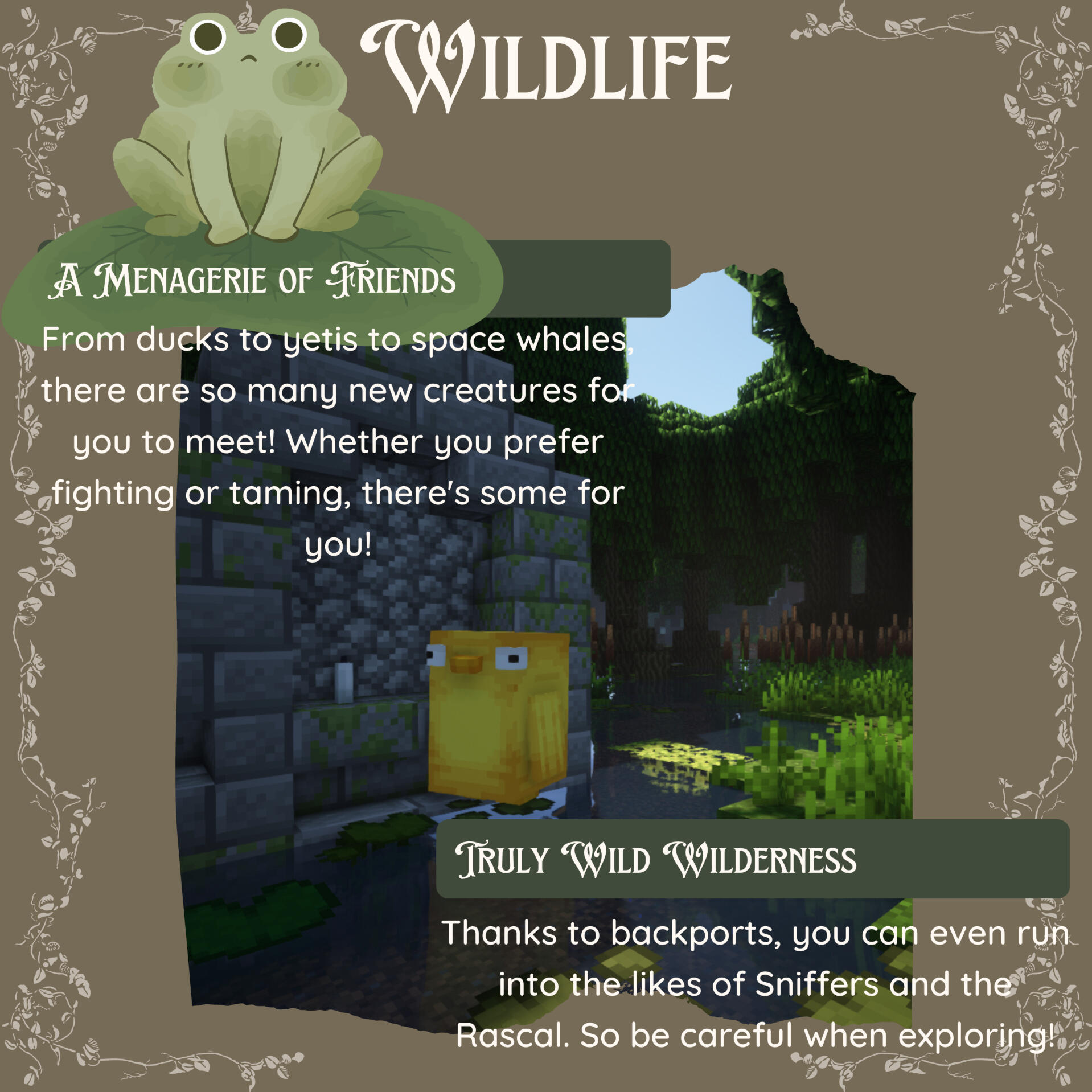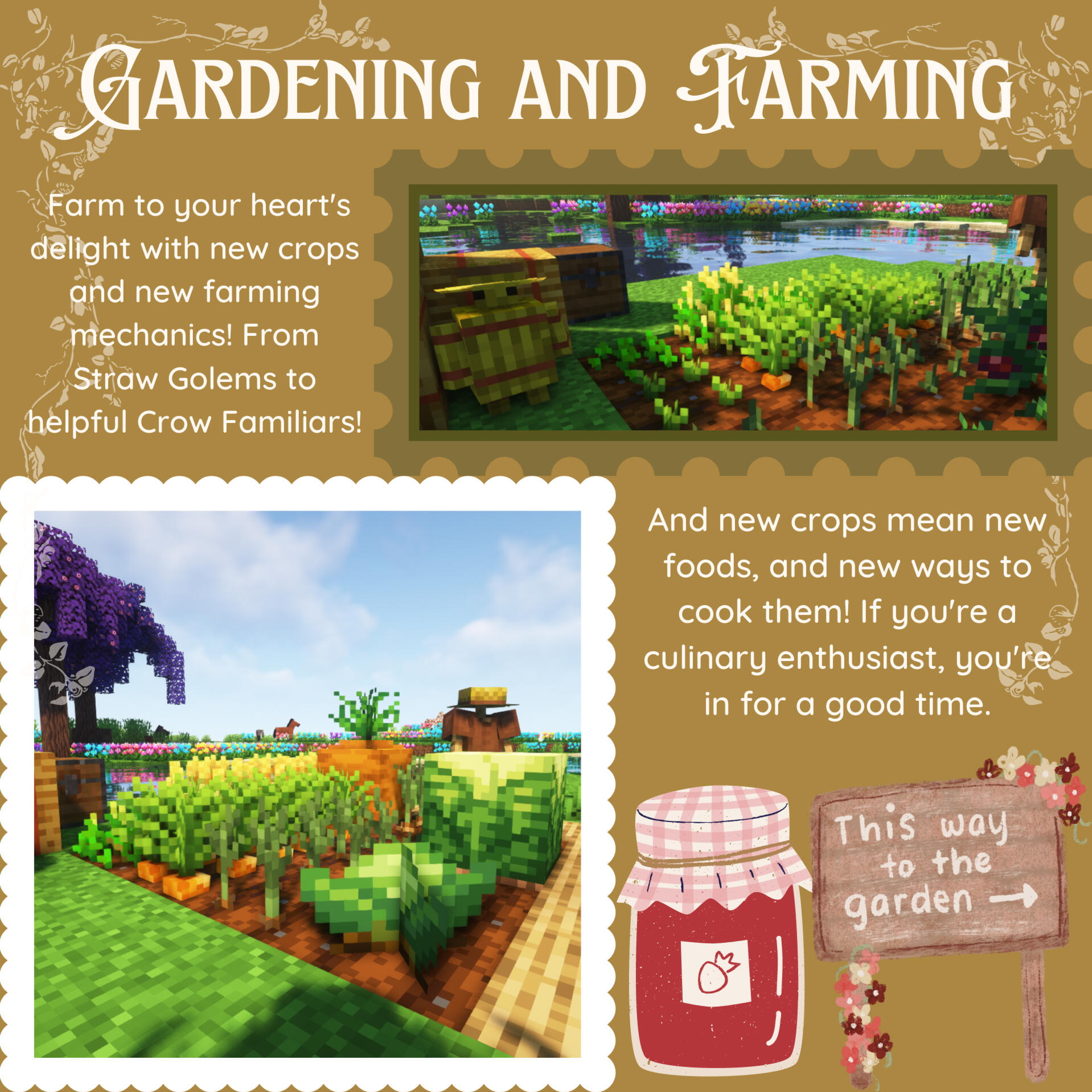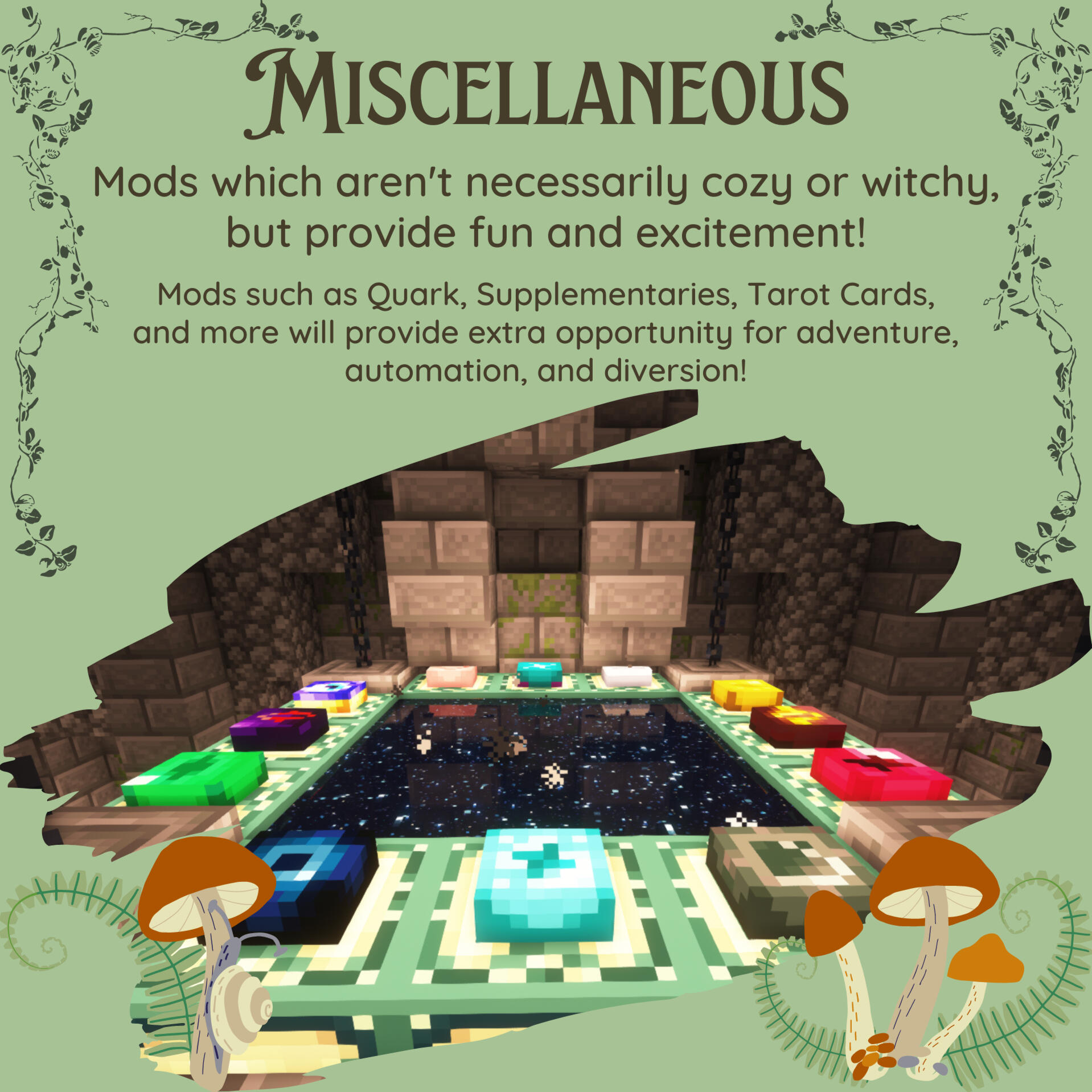 Welcome to the Features section of Cottage Witch, a modpack that adds a wealth of new content and quality of life improvements to Minecraft. With custom recipes, players can discover new ways to craft items and enhance their gameplay experience. But Cottage Witch is more than just a crafting modpack - it also features new biomes to explore, including forests and snowy areas filled with new animals and structures to find. And if you're feeling particularly adventurous, you can even journey through new dimensions, each with its own unique challenges and rewards.But for those who prefer a more domestic approach to magic, Cottage Witch has plenty to offer as well. Build the perfect cozy witch's cabin and furnish it with a variety of custom decorations, from cauldrons and broomsticks to magical crystals and books. Take advantage of quality of life features like auto-smelting and inventory sorting to streamline your gameplay experience. And with powerful magic mods like Hexerei and Ars Nouveau, you'll have the tools you need to take on any foe that comes your way.Whether you're looking for adventure or simply want to create the perfect home base, Cottage Witch has something for everyone. So why not give it a try and discover the magic of this enchanting modpack?