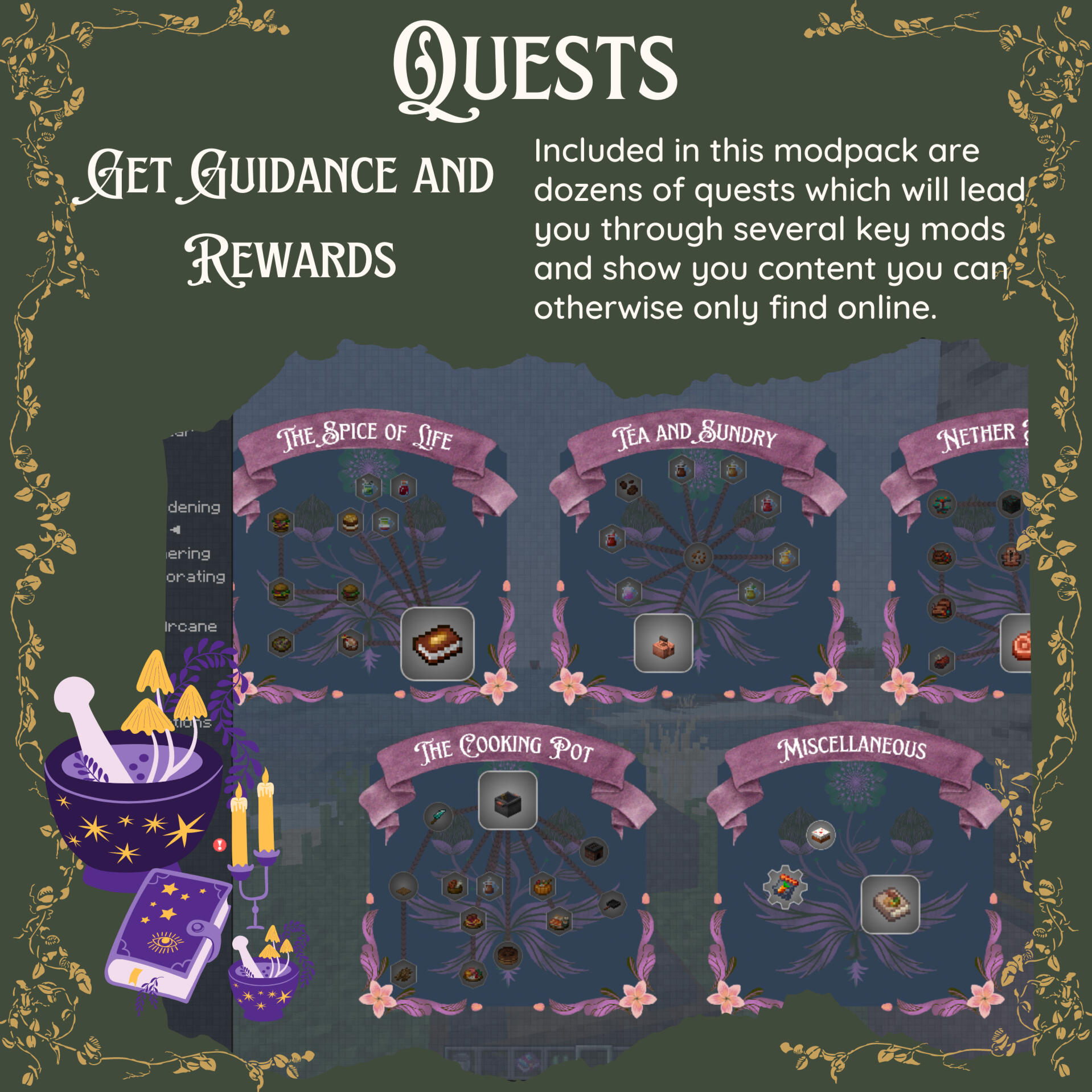 Welcome to the Quests section of Cottage Witch, a modpack that offers a unique questing experience for players of all skill levels. Using FTB Quests, there are hundreds of paths to follow, each designed to inform and reward players as they progress through the game.Whether you're a collector, a combat enthusiast, an automation expert, or simply love taming animals, there's a quest or two for everyone. As you complete quests, you'll earn rewards like experience points, rare items, and more! And with a wide range of quest types, from exploration and combat to crafting and automation, you'll always have something new to discover.But the quests in Cottage Witch are more than just a way to earn rewards - they're also designed to teach players about the different mods in the pack. As you progress through the game, you'll learn about kitchen witchery, herbalism, and other magical practices that will help you become a powerful and skilled witch.